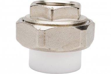 Комбинированные разъемные полипропиленовые фитинги имеют накидную гайку и резьбовую втулку из латуни марки CW617N с никелированным покрытием и служат для получения разъемного соединения. На резьбовой части фитинга имеется шестигранник, за который муфта удерживается при затяжке. Герметичность разъемного соединения достигается благодаря плоскому уплотнительному кольцу из EPDM.