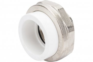 Комбинированные разъемные полипропиленовые фитинги имеют накидную гайку и резьбовую втулку из латуни марки CW617N с никелированным покрытием и служат для получения разъемного соединения. На резьбовой части фитинга имеется шестигранник, за который муфта удерживается при затяжке. Герметичность разъемного соединения достигается благодаря плоскому уплотнительному кольцу из EPDM.
