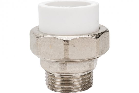 Комбинированные разъемные полипропиленовые фитинги имеют накидную гайку и резьбовую втулку из латуни марки CW617N с никелированным покрытием и служат для получения разъемного соединения. На резьбовой части фитинга имеется шестигранник, за который муфта удерживается при затяжке. Герметичность разъемного соединения достигается благодаря плоскому уплотнительному кольцу из EPDM.