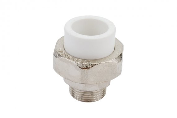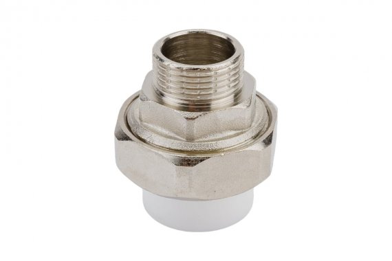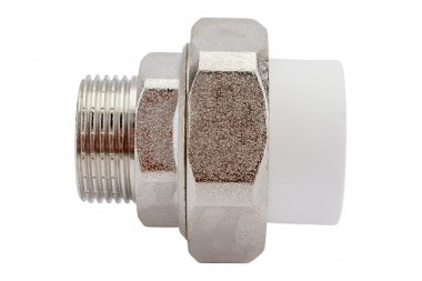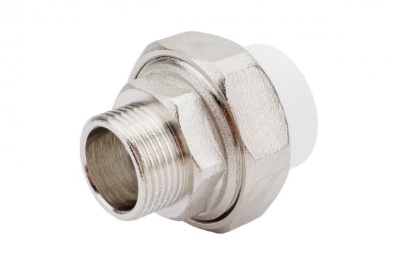 Комбинированные разъемные полипропиленовые фитинги имеют накидную гайку и резьбовую втулку из латуни марки CW617N с никелированным покрытием и служат для получения разъемного соединения. На резьбовой части фитинга имеется шестигранник, за который муфта удерживается при затяжке. Герметичность разъемного соединения достигается благодаря плоскому уплотнительному кольцу из EPDM.