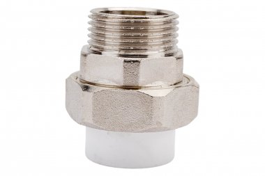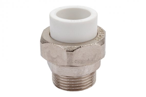 Комбинированные разъемные полипропиленовые фитинги имеют накидную гайку и резьбовую втулку из латуни марки CW617N с никелированным покрытием и служат для получения разъемного соединения. На резьбовой части фитинга имеется шестигранник, за который муфта удерживается при затяжке. Герметичность разъемного соединения достигается благодаря плоскому уплотнительному кольцу из EPDM.