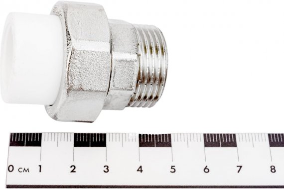 Комбинированные разъемные полипропиленовые фитинги имеют накидную гайку и резьбовую втулку из латуни марки CW617N с никелированным покрытием и служат для получения разъемного соединения. На резьбовой части фитинга имеется шестигранник, за который муфта удерживается при затяжке. Герметичность разъемного соединения достигается благодаря уплотнительному кольцу с круглым сечением из EPDM.
