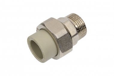 Комбинированные разъемные полипропиленовые фитинги имеют накидную гайку и резьбовую втулку из латуни марки CW617N с никелированным покрытием и служат для получения разъемного соединения. На резьбовой части фитинга имеется шестигранник, за который муфта удерживается при затяжке. Герметичность разъемного соединения достигается благодаря плоскому уплотнительному кольцу из EPDM.