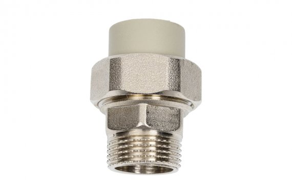 Комбинированные разъемные полипропиленовые фитинги имеют накидную гайку и резьбовую втулку из латуни марки CW617N с никелированным покрытием и служат для получения разъемного соединения. На резьбовой части фитинга имеется шестигранник, за который муфта удерживается при затяжке. Герметичность разъемного соединения достигается благодаря плоскому уплотнительному кольцу из EPDM.