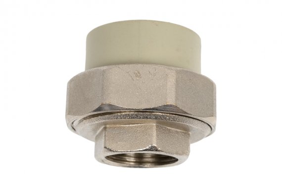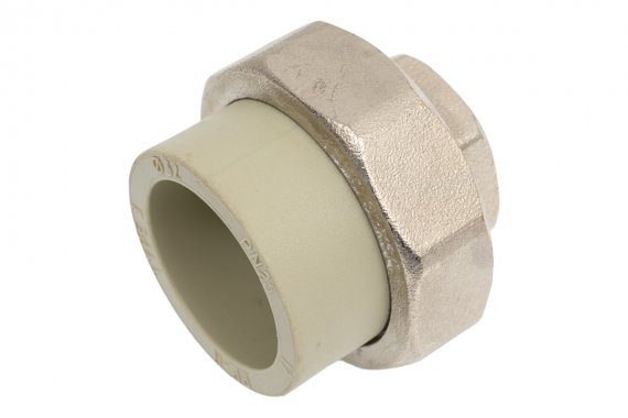 Комбинированные разъемные полипропиленовые фитинги имеют накидную гайку и резьбовую втулку из латуни марки CW617N с никелированным покрытием и служат для получения разъемного соединения. На резьбовой части фитинга имеется шестигранник, за который муфта удерживается при затяжке. Герметичность разъемного соединения достигается благодаря уплотнительному кольцу с круглым сечением из EPDM.