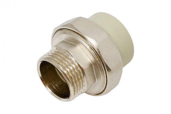 Комбинированные разъемные полипропиленовые фитинги имеют накидную гайку и резьбовую втулку из латуни марки CW617N с никелированным покрытием и служат для получения разъемного соединения. На резьбовой части фитинга имеется шестигранник, за который муфта удерживается при затяжке. Герметичность разъемного соединения достигается благодаря уплотнительному кольцу с круглым сечением из EPDM.