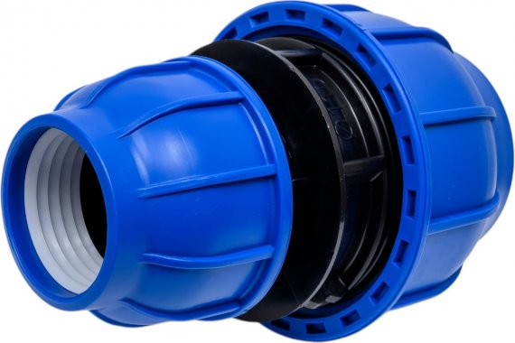 Корпус компрессионного фитинга TEBO technics отлит из черного полипропилена. Соединение накидной гайки и корпуса осуществляется при помощи трапециевидной резьбы, позволяющей выдерживать большие осевые нагрузки. Накидная гайка произведена из полипропилена синего цвета, который имеет высокую прочность. Уплотнительное кольцо круглого сечения изготовлено из бутадиен-нитрильного каучука (NBR) обеспечивает герметичное соединение ПЭ трубы с корпусом фитинга. Запрессовывающая втулка из полипропилена удерживает уплотнительное кольцо в фиксированном положении. Разрезное зажимное кольцо отлито из полиацэталя — материала, который обладает более высокой твердостью, чем полиэтилен. Благодаря специальному профилю внутренней поверхности, зажимное кольцо предотвращает выдавливание полиэтиленовой трубы из корпуса внутренним давлением воды.