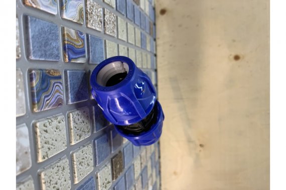 Корпус компрессионного фитинга TEBO technics отлит из черного полипропилена. Соединение накидной гайки и корпуса осуществляется при помощи трапециевидной резьбы, позволяющей выдерживать большие осевые нагрузки. Накидная гайка произведена из полипропилена синего цвета, который имеет высокую прочность. Уплотнительное кольцо круглого сечения изготовлено из бутадиен-нитрильного каучука (NBR) обеспечивает герметичное соединение ПЭ трубы с корпусом фитинга. Запрессовывающая втулка из полипропилена удерживает уплотнительное кольцо в фиксированном положении. Разрезное зажимное кольцо отлито из полиацэталя — материала, который обладает более высокой твердостью, чем полиэтилен. Благодаря специальному профилю внутренней поверхности, зажимное кольцо предотвращает выдавливание полиэтиленовой трубы из корпуса внутренним давлением воды.