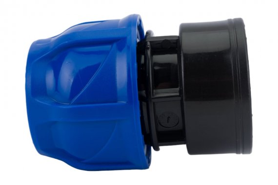 Корпус компрессионного фитинга TEBO technics отлит из черного полипропилена. Соединение накидной гайки и корпуса осуществляется при помощи трапециевидной резьбы, позволяющей выдерживать большие осевые нагрузки. Накидная гайка произведена из полипропилена синего цвета, который имеет высокую прочность. Уплотнительное кольцо круглого сечения изготовлено из бутадиен-нитрильного каучука (NBR) обеспечивает герметичное соединение ПЭ трубы с корпусом фитинга. Запрессовывающая втулка из полипропилена удерживает уплотнительное кольцо в фиксированном положении. Разрезное зажимное кольцо отлито из полиацэталя — материала, который обладает более высокой твердостью, чем полиэтилен. Благодаря специальному профилю внутренней поверхности, зажимное кольцо предотвращает выдавливание полиэтиленовой трубы из корпуса внутренним давлением воды.