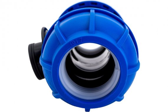 Корпус компрессионного фитинга TEBO technics отлит из черного полипропилена. Соединение накидной гайки и корпуса осуществляется при помощи трапециевидной резьбы, позволяющей выдерживать большие осевые нагрузки. Накидная гайка произведена из полипропилена синего цвета, который имеет высокую прочность. Уплотнительное кольцо круглого сечения изготовлено из бутадиен-нитрильного каучука (NBR) обеспечивает герметичное соединение ПЭ трубы с корпусом фитинга. Запрессовывающая втулка из полипропилена удерживает уплотнительное кольцо в фиксированном положении. Разрезное зажимное кольцо отлито из полиацэталя — материала, который обладает более высокой твердостью, чем полиэтилен. Благодаря специальному профилю внутренней поверхности, зажимное кольцо предотвращает выдавливание полиэтиленовой трубы из корпуса внутренним давлением воды.